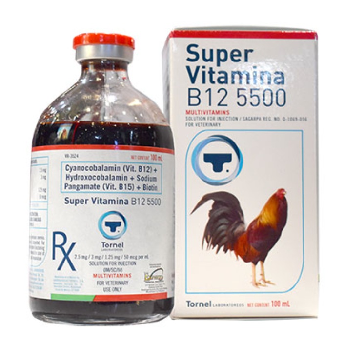 Tornel Super Vitamina B12 5500, a veterinary injectable multivitamin, especially popular for conditioning gamefowl (cocks) and other animals, acting as an appetite stimulant, aiding nervous system function, and recovering from deficiencies, containing B12 (cyanocobalamin & hydroxocobalamin), B15 (Pangamate), and Biotin.